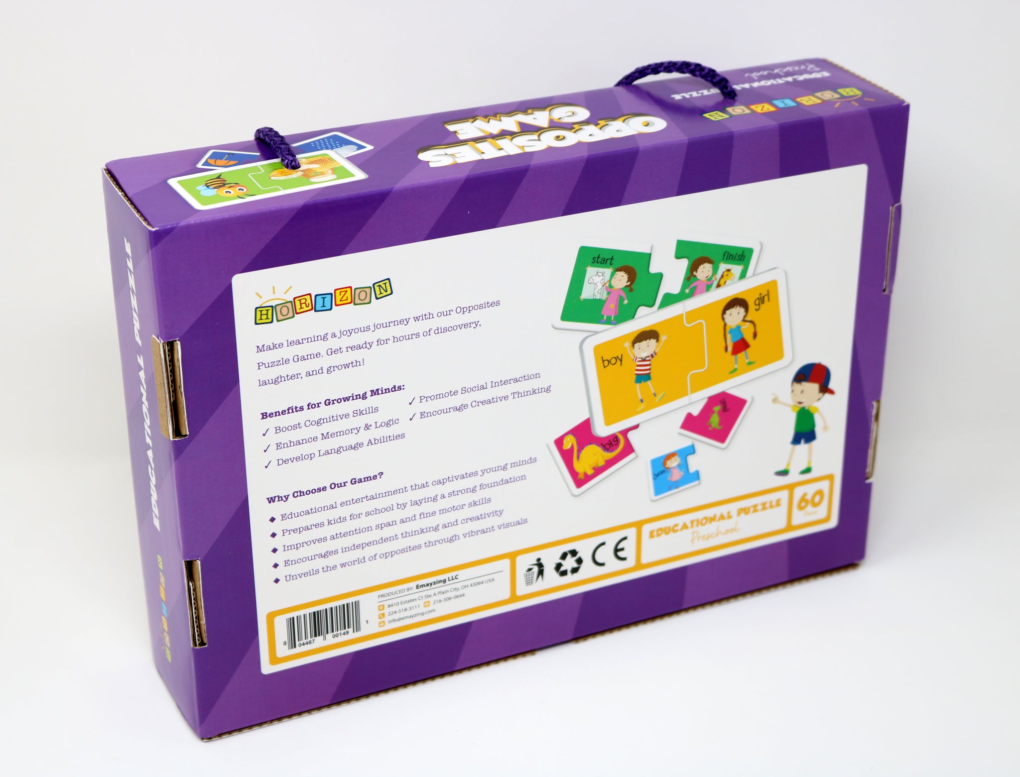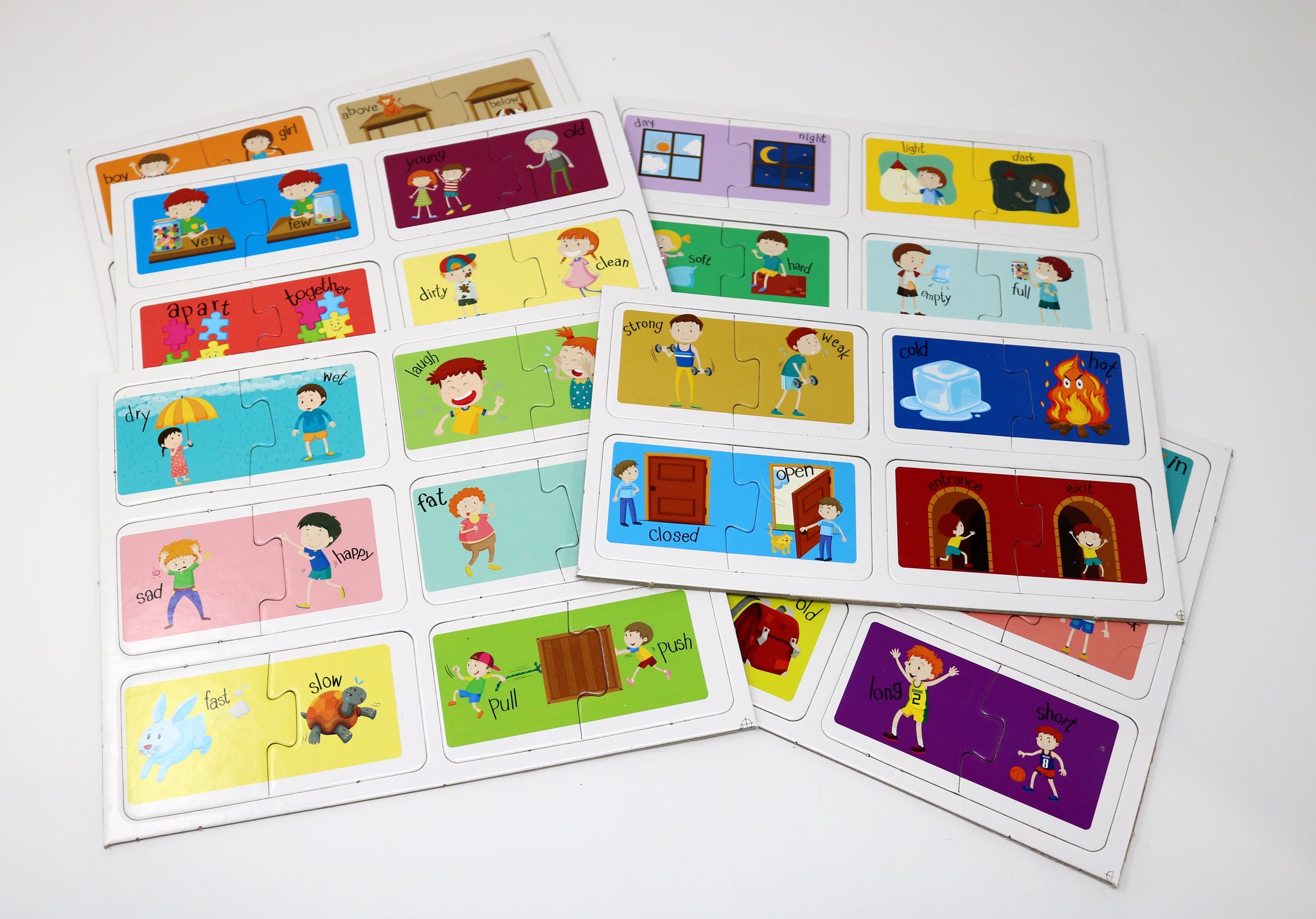 In the Horizon Educational Puzzle Opposites Game, there are 60 game cards consisting of 30 different opposite concepts. It includes many memorable opposite expressions like big-small, above-below, night-day.