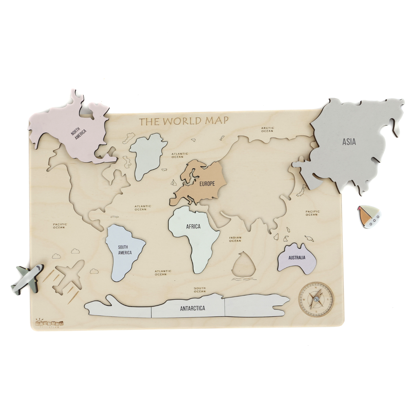 Introduce young explorers to the world with the World Map Montessori wooden puzzle. This engaging map puzzle encourages children to identify each continent and ocean by placing brightly illustrated pieces in their correct locations. Through this hands-on activity, kids build spatial reasoning and fine motor skills while learning geographic shapes and placements. Crafted from sturdy, natural wood (free of harmful chemicals), this Montessori-style puzzle is built for years of play. Each piece is sanded smooth and coated with non-toxic, child-safe paint, so it remains safe even if little ones put it in their mouths. The world map is labeled in clear English, making it ideal for both home and classroom learning. Packaged in a kid-friendly gift box, it makes an ideal birthday present for boys and girls ages 3 and up – a toy that both entertains and educates.