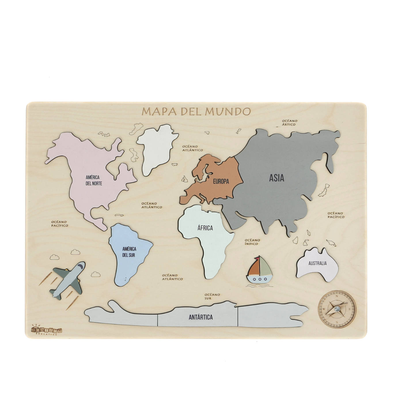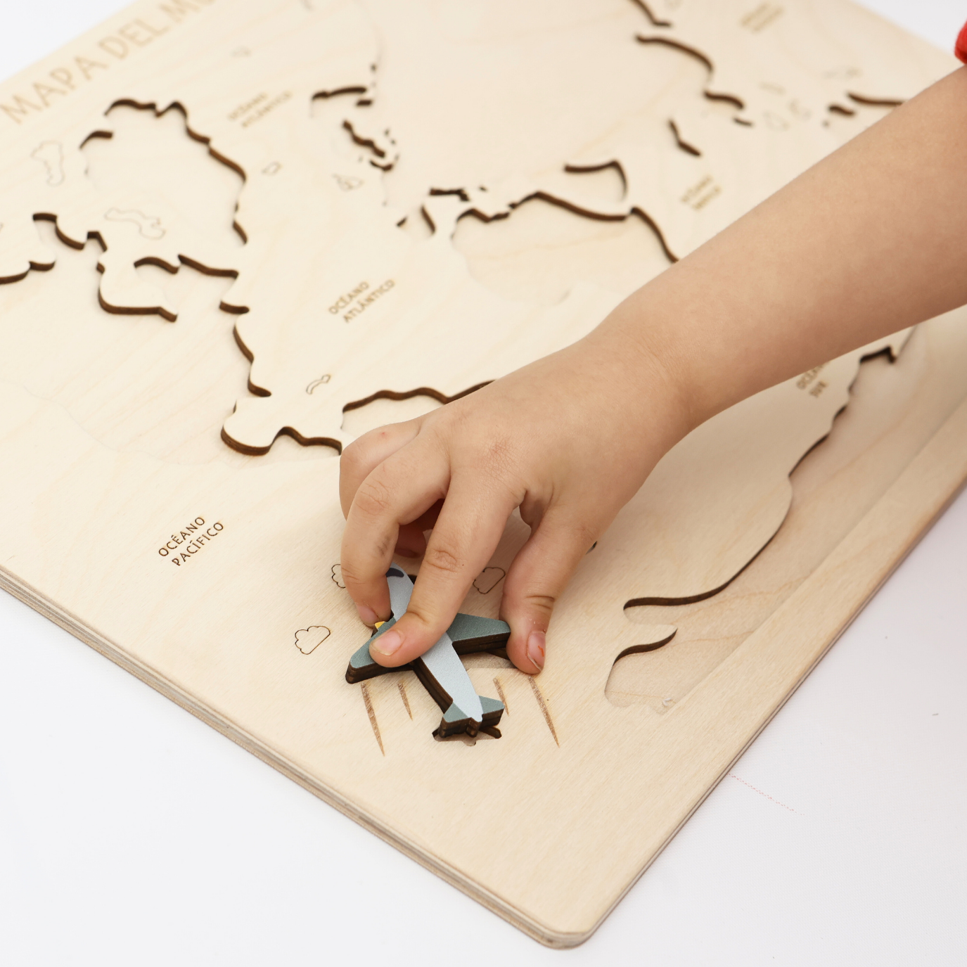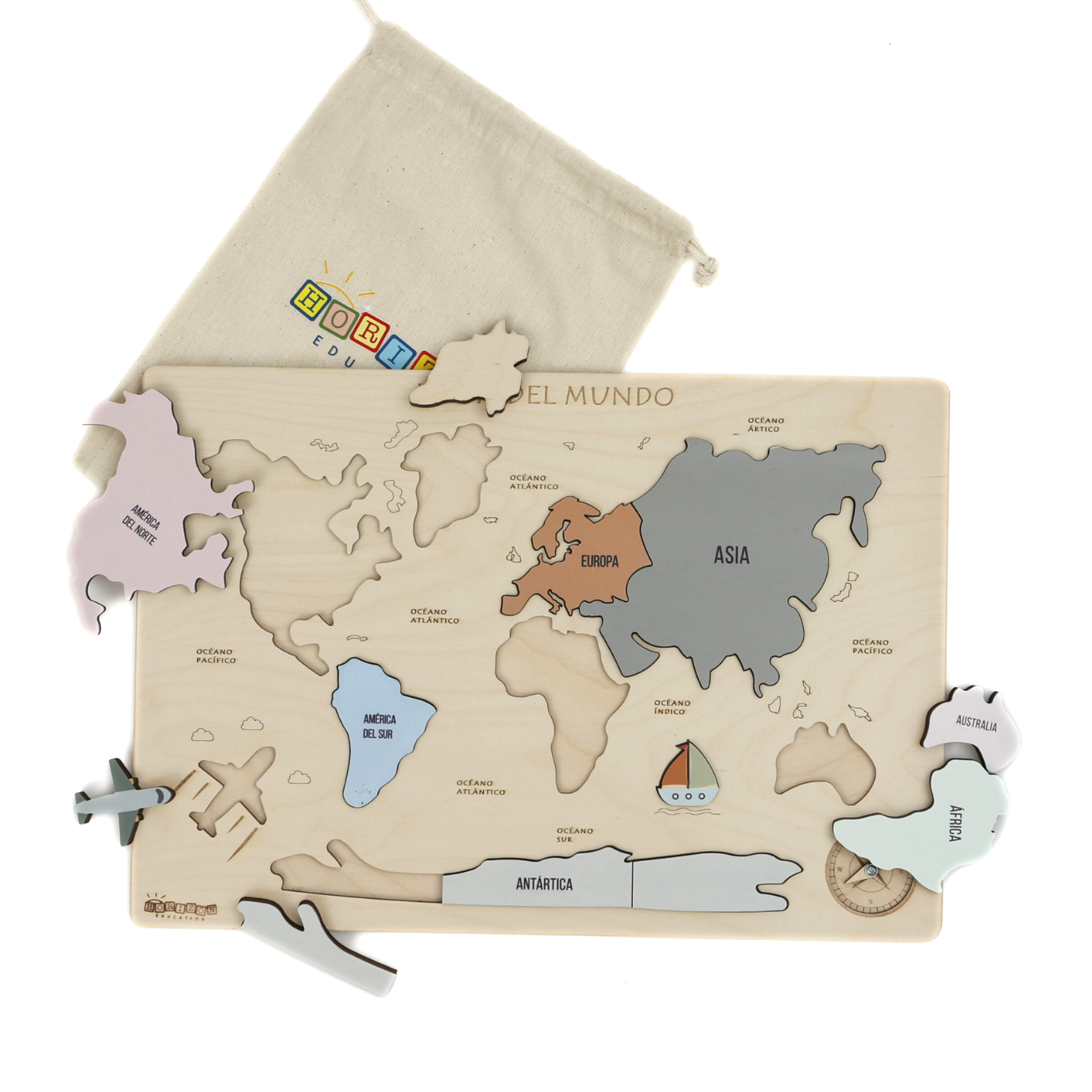- Bilingual World Map Puzzle – Wooden puzzle featuring continents and oceans, available in both English and Spanish versions.