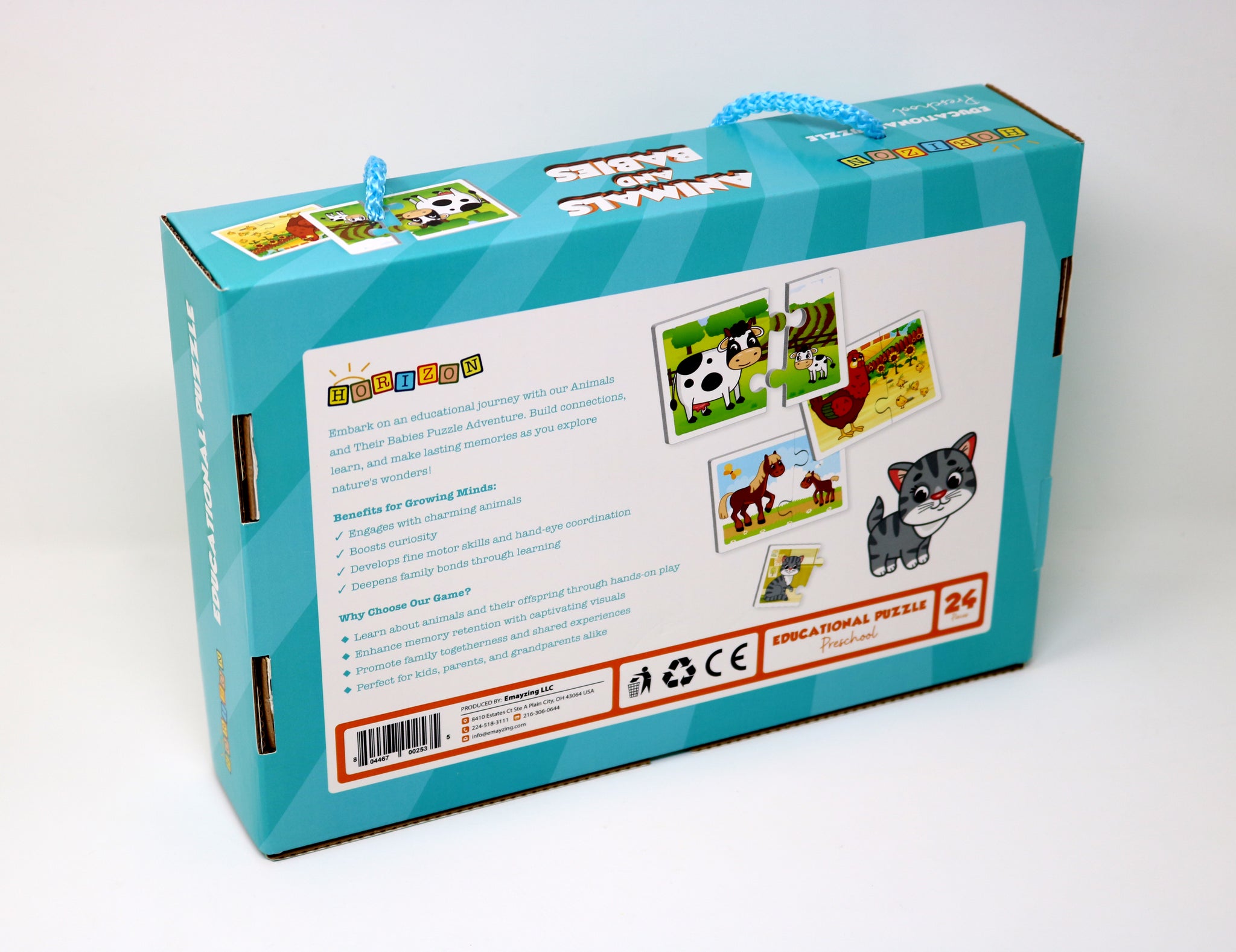 The Horizon Educational Puzzle Animals and Babies Game Cards are perfect for 2-5 year old children. The cards feature high-quality images of baby animals and their mothers, with simple and clear text. The game includes 54 cards, with 26 pairs of cards, and a storage box for easy organization. The cards are designed to be durable and easy to shuffle, making them perfect for family game nights. The game is designed to strengthen the relationship between concepts, such as baby animals and their mothers, and to promote cognitive development in children. It also helps to develop hand-eye coordination, fine motor skills, and social skills. The game is easy to play and can be played with multiple players, making it a great way to spend quality time with family and friends.