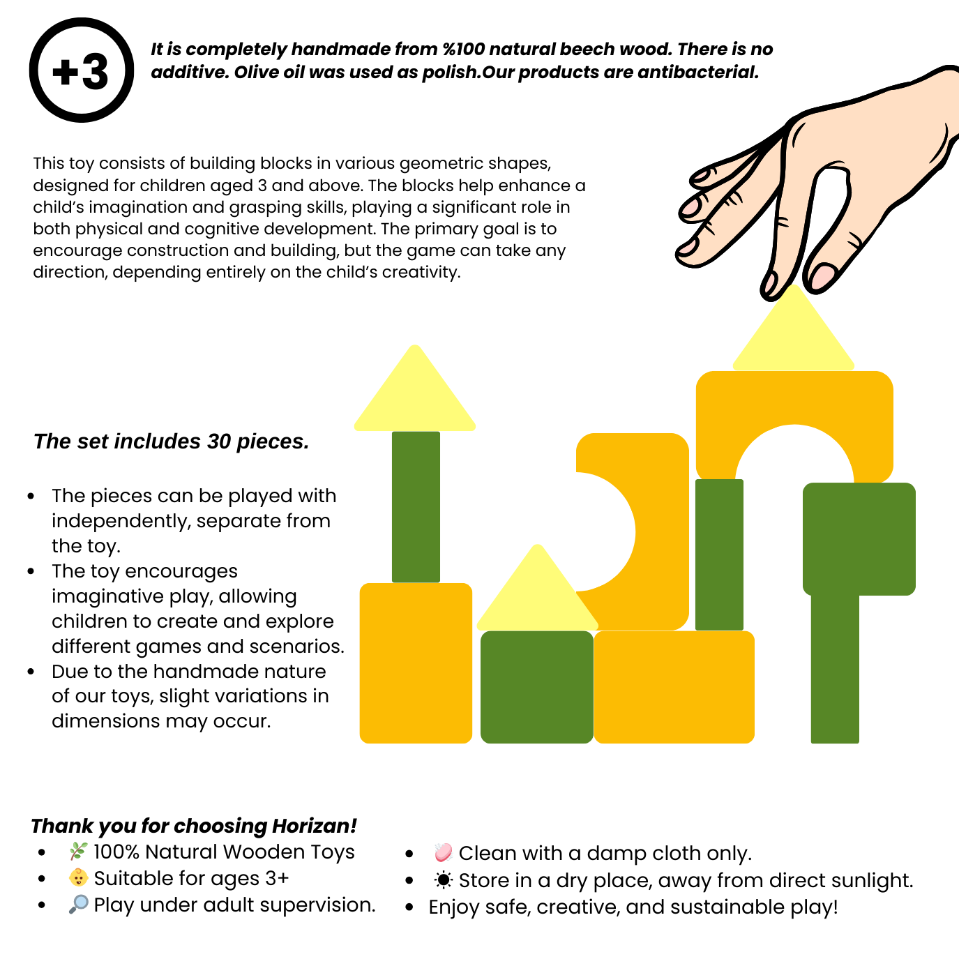 Natural Beech Wood Building Blocks – 30-Piece Montessori Wooden Stacking Set for Toddlers | Handmade, Non-Toxic, Polished with Olive Oil | Ages 3+