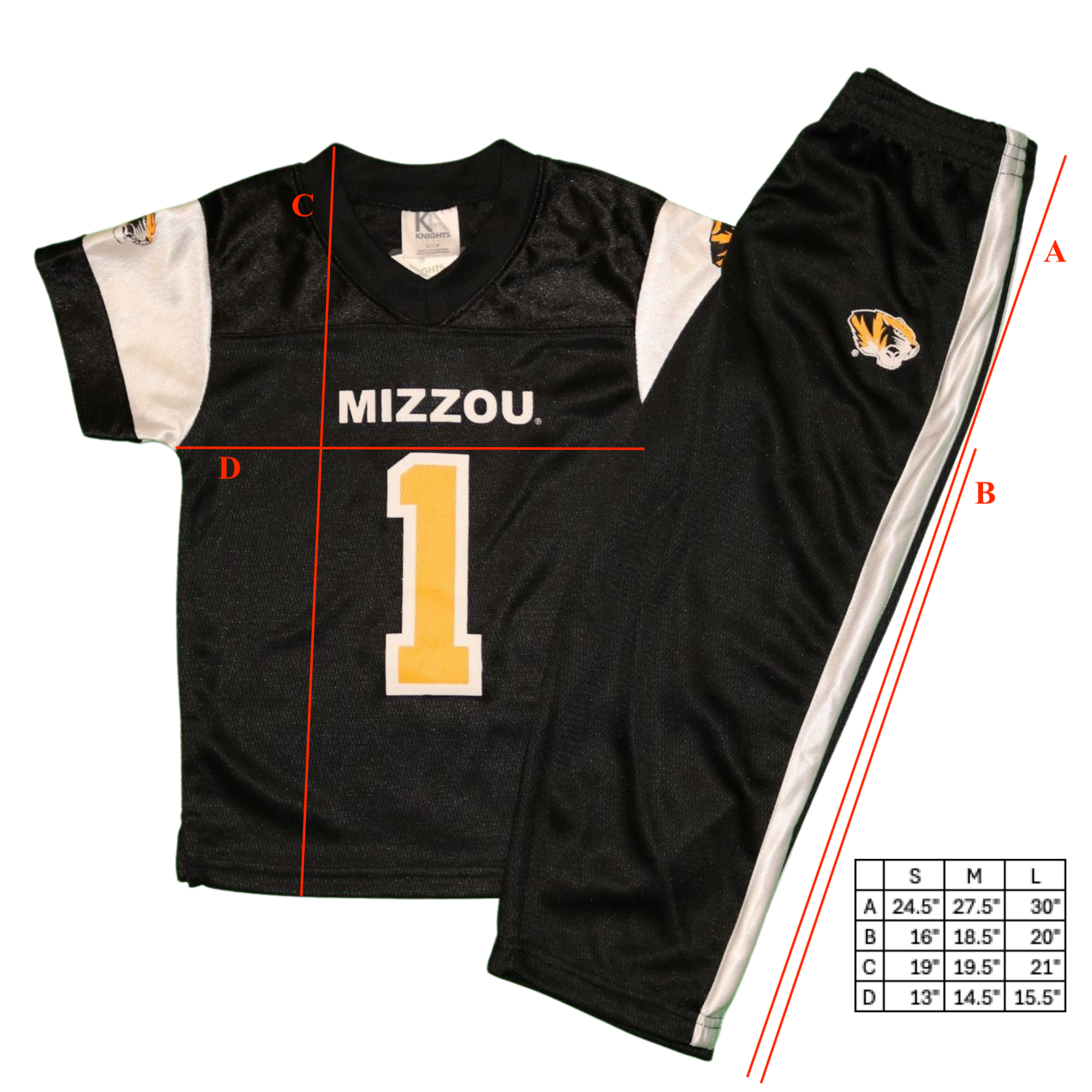 - “MIZZOU” and “TIGERS” team name print with jersey number “1”