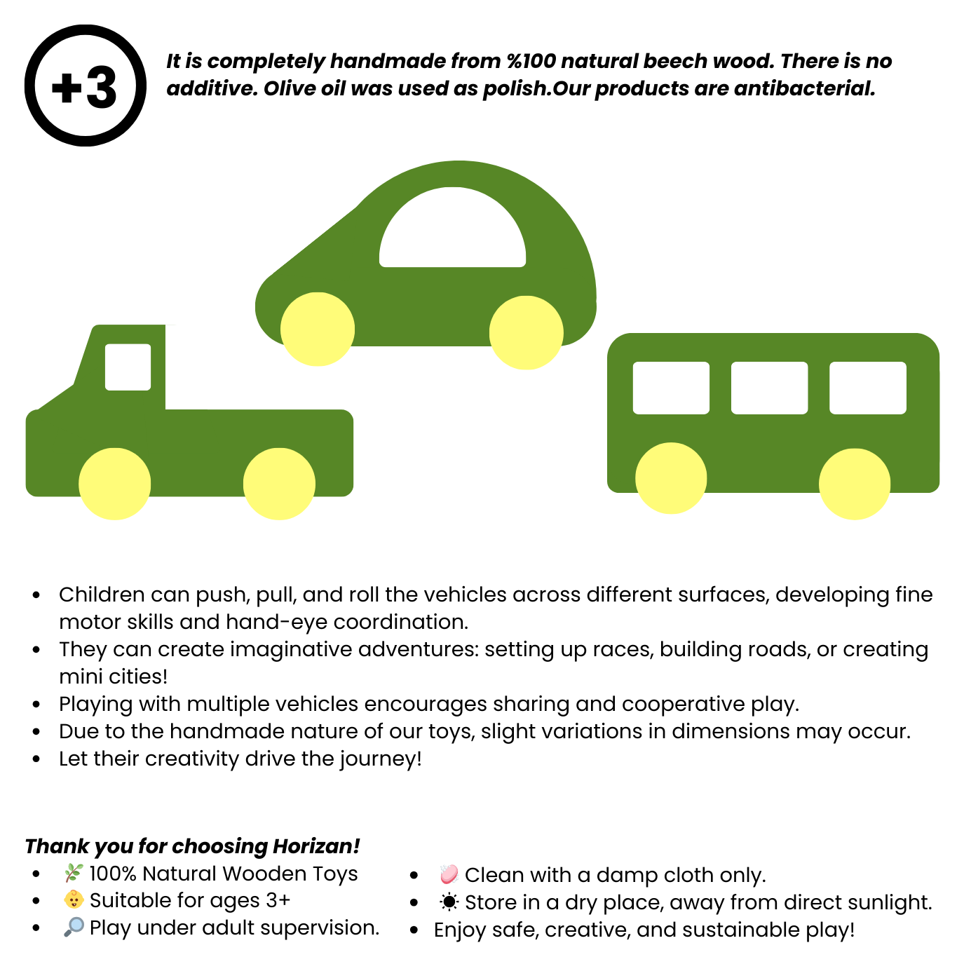 - Includes 3 Vehicles: Wooden car, truck, and bus in one set