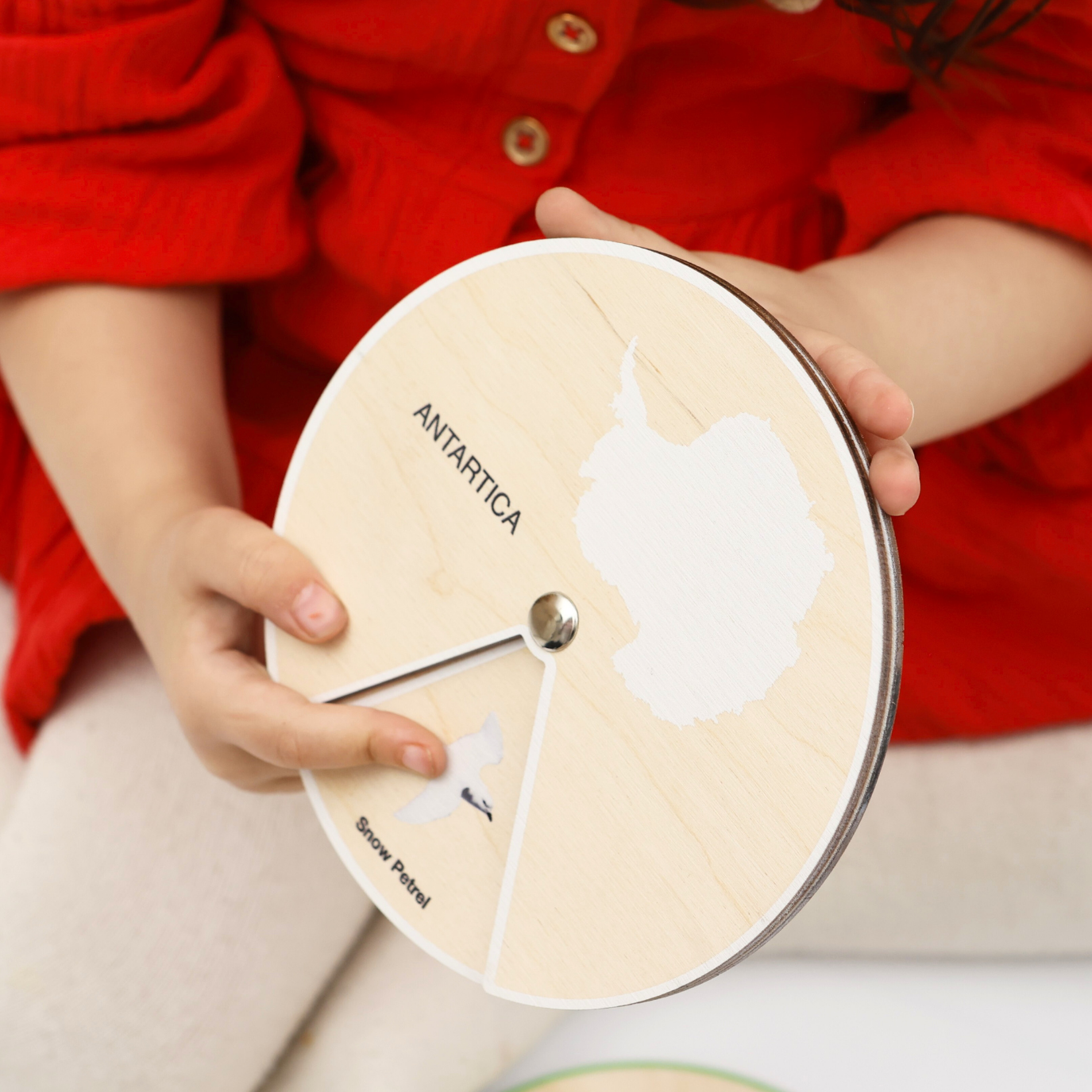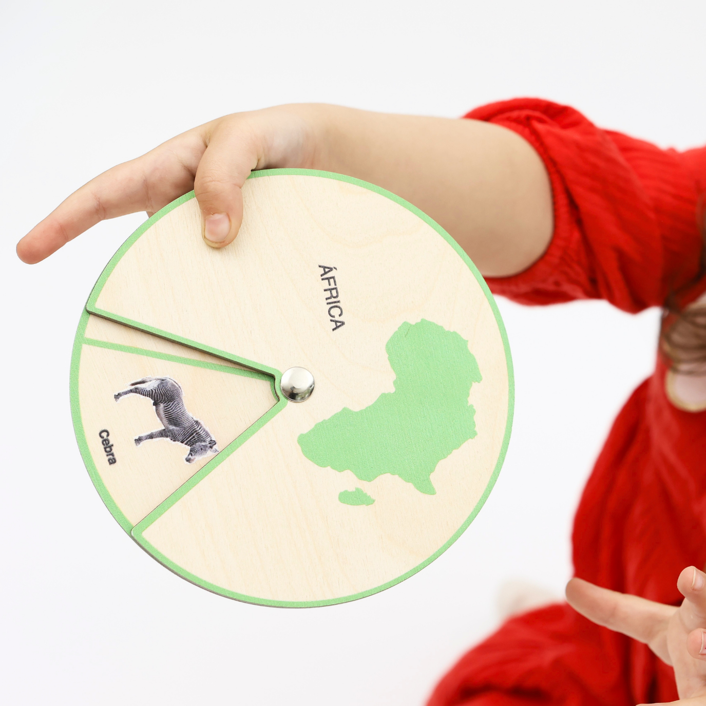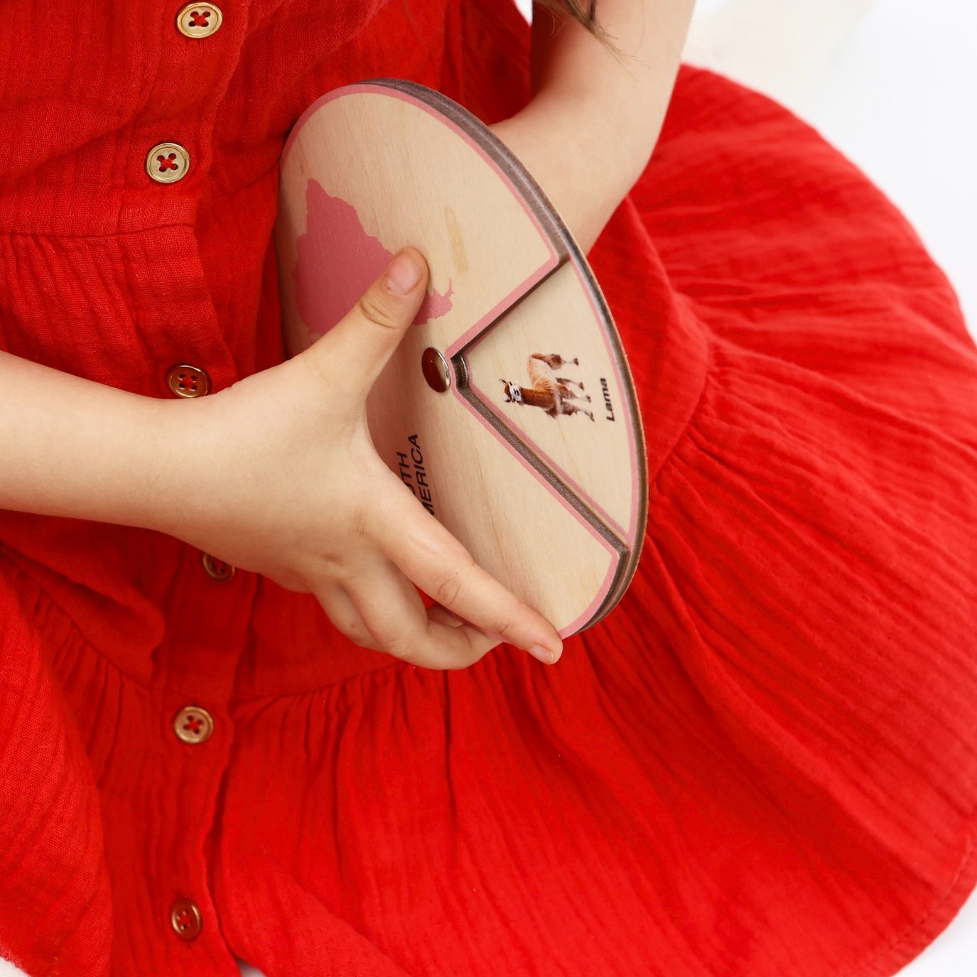 - Explore the World Through Animals – Includes 7 wooden wheels (one per continent) with a total of 42 animals to teach kids about global wildlife.